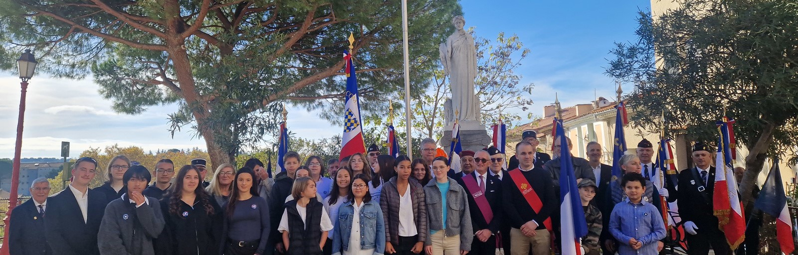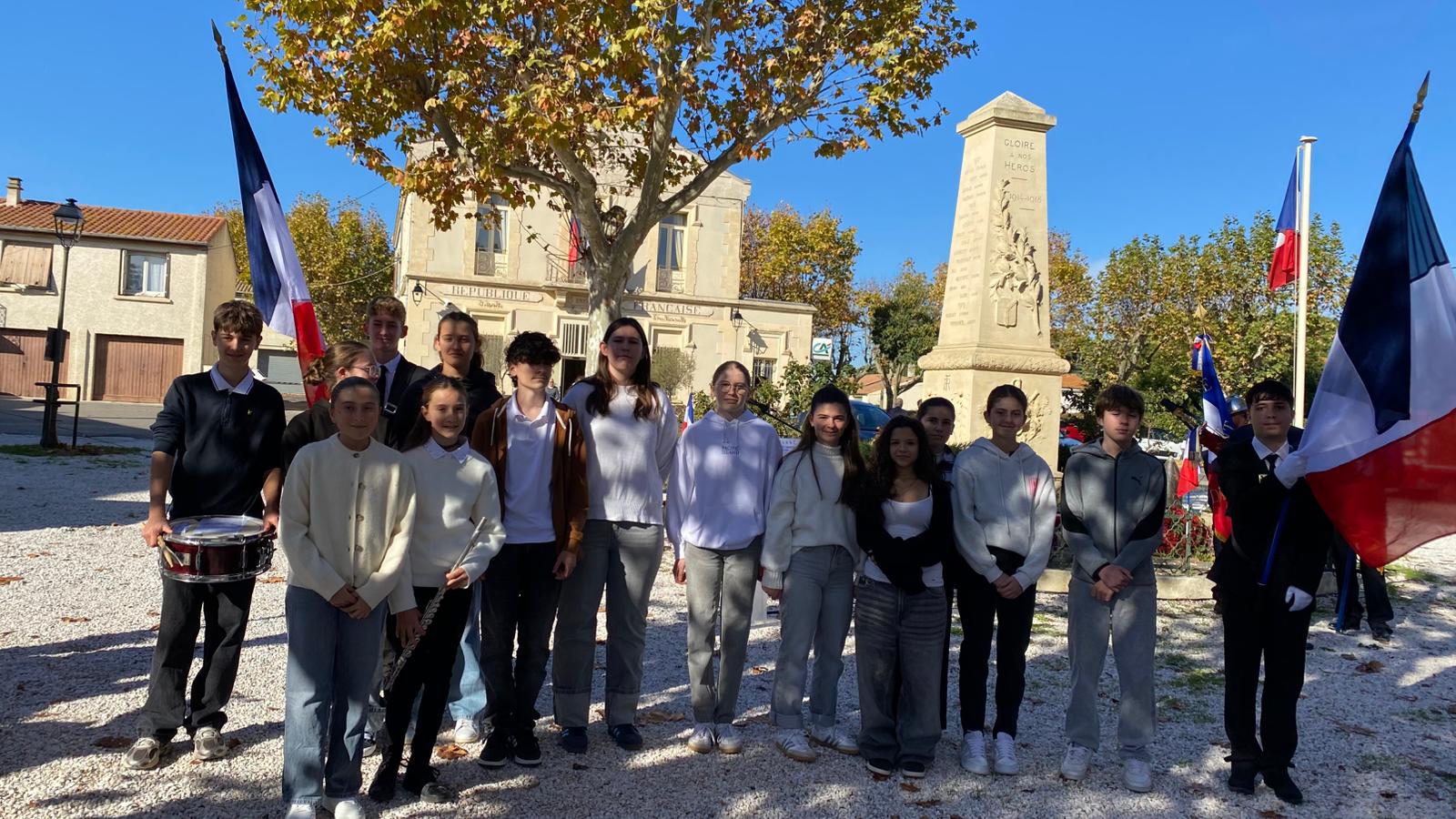 Des élèves de 3ème ont accepté de participer à la commémoration de l'Armistice en tant que lecteur, vendeur de bleuets, photographe ou musicien. Merci aux petits et aux élèves (actuels et anciens) qui les ont rejoints pour les photos finales.